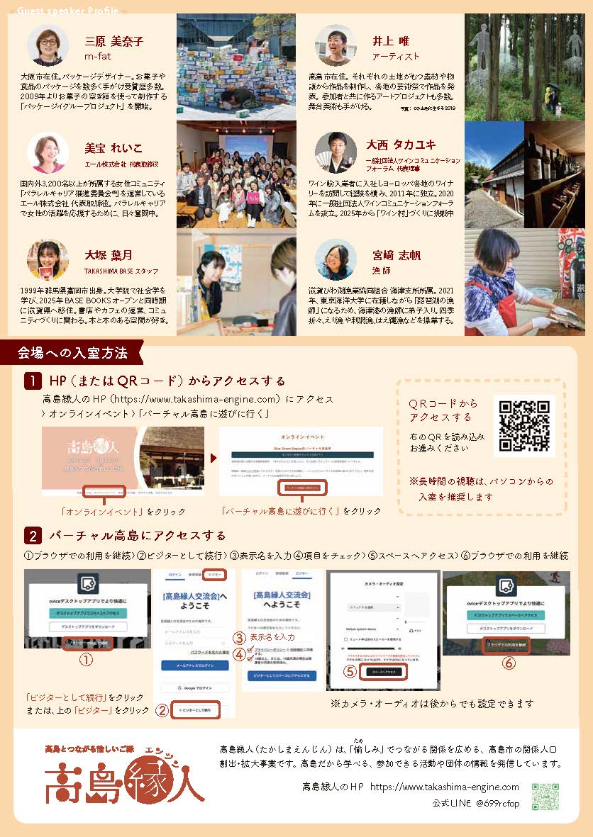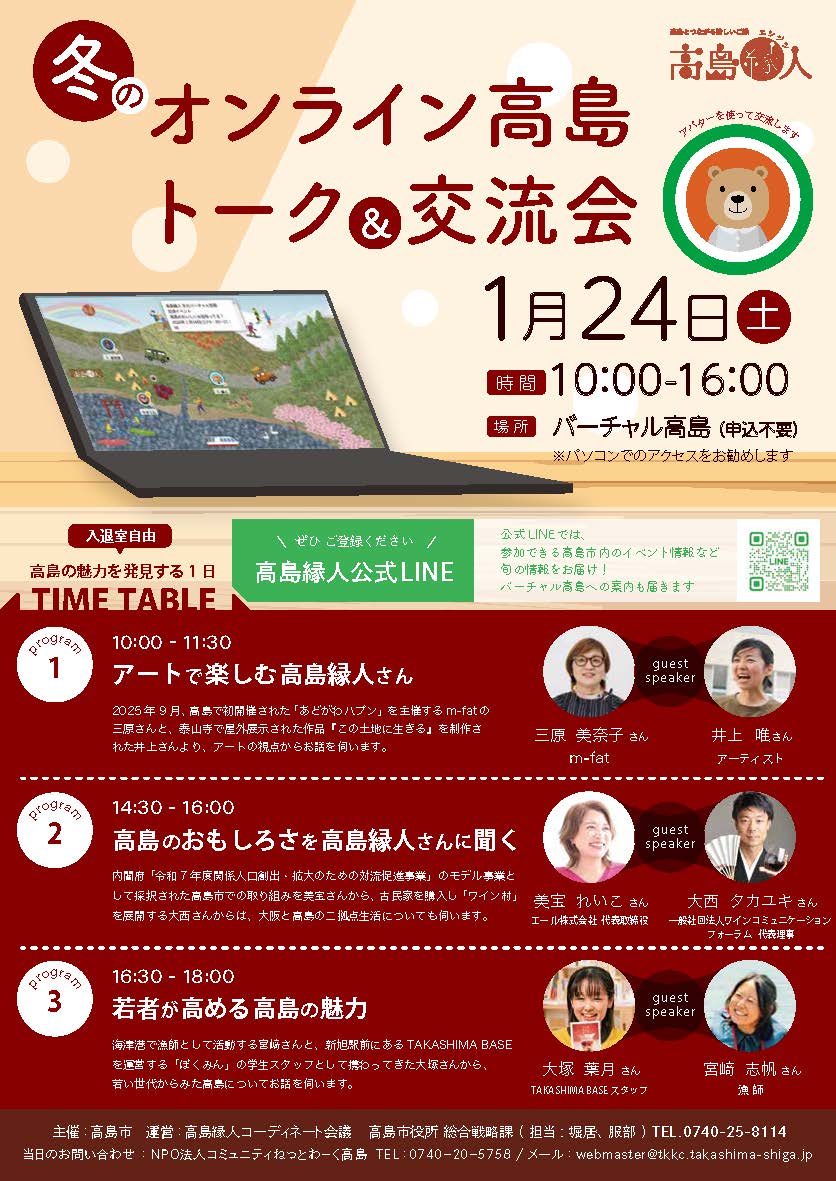 - 開催場所 バーチャル高島(オンライン) ※パソコンでの入室をおすすめします。