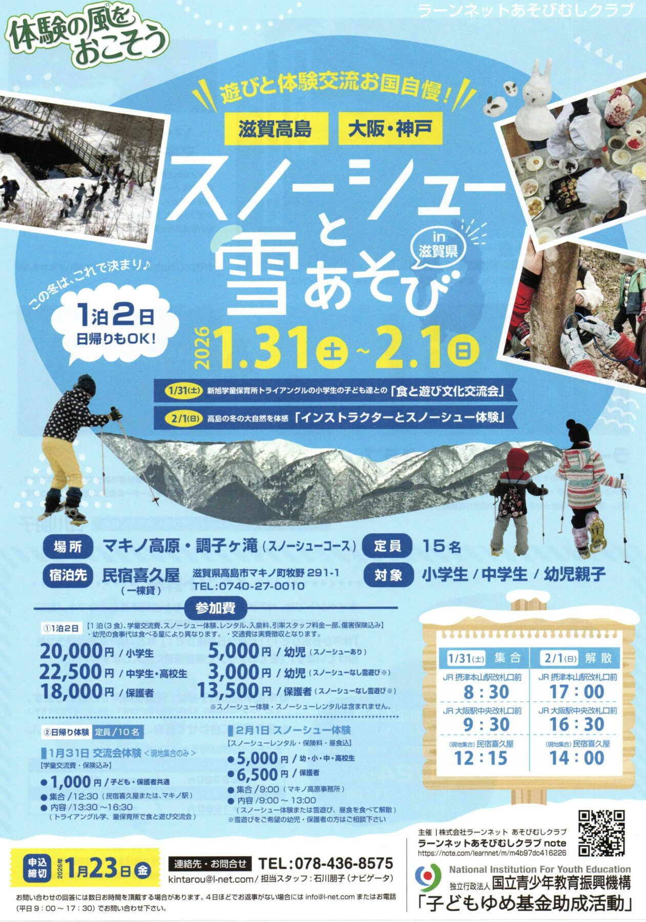1泊(3食)、学童交流費、スノーシュー体験、レンタル、入泉料、引率スタッフ料金一部、傷害保険込み