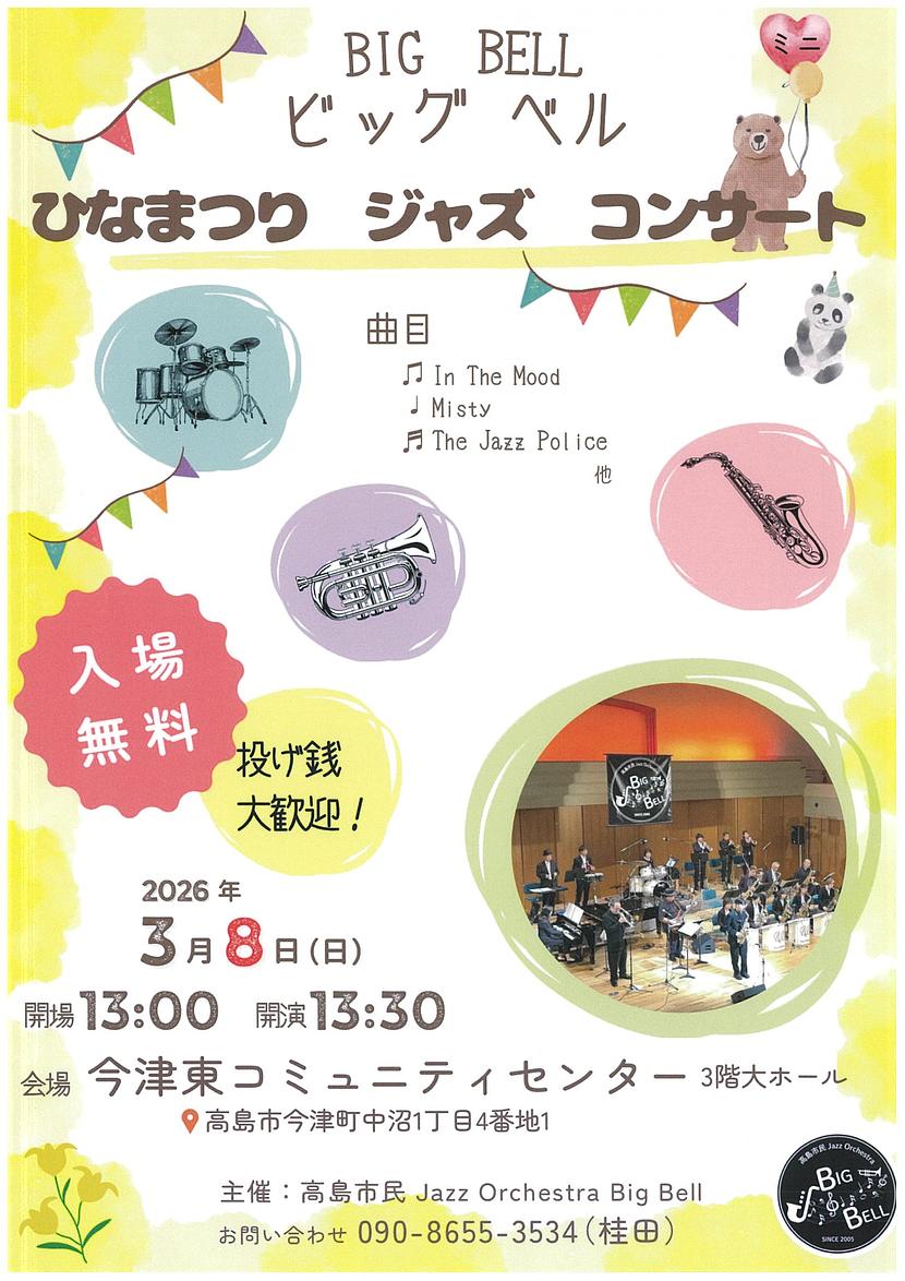 Big Bell「ひなまつり ジャズ コンサート」 投稿日 2026年2月25日 著者 concie カテゴリー イベント 曲目 ♪ In The Mood ♪Misty ♪The Jazz Police 他 開催日 2026年3月8日(日) 開場時刻 13:00 開演 13:30 開催場所 今津東コミュニティセンター3階大ホール 高島市今津町中沼1丁目4-1 入場 無料 投げ銭大歓迎! 主催 高島市民 Jazz Orchestra Big Bell 後援 高島市 高島市教育委員会 公益法人 びわ湖観光協会 お問い合わせ TEL:090-8655-3534(桂田) チラシ ツイート pickup